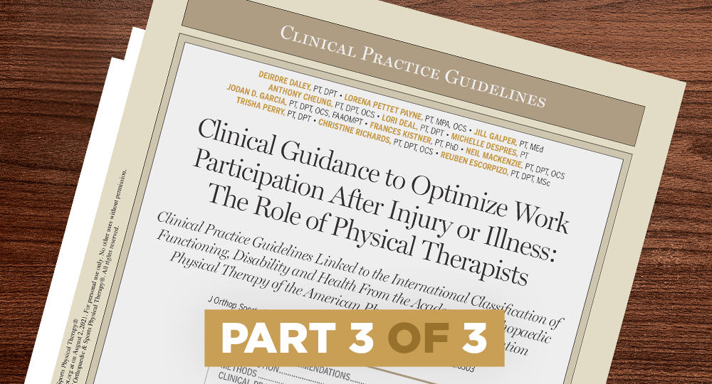 Watch part 3 of a 3-part series where we hear from authors of the Clinical Guidance to Optimize Work Participation After Injury or Illness: The Role of Physical Therapists. Join Lorena P. Payne, PT, MPA, OCS, Lori Deal, PT, DPT and Michelle Despres, PT, as they present their findings in their published work comp clinical practice guidelines that were linked to the International Classification of Functioning and Disability and Health. This third webinar will focus on practical applications you can implement today when working with a workers’ comp rehab patient.